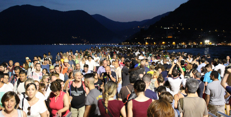 la fila scorre e ad un certo punto attraverso una scalinata, si imbocca un vicolo sulla sinistra ed una curva a destra, che porta alla passerella che fa salire sul ponte galleggiante. I volontari chiedono di andarea abbastanza velocemente e un gruppo di 300 persone percorre questa stradina ad "s" e sale sulla passerella, ricoperta di telone giallo.