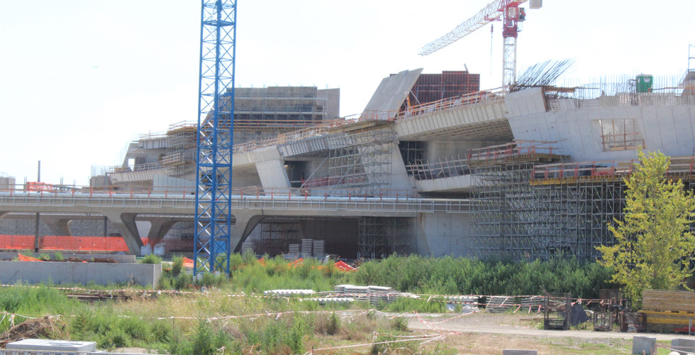 Il cantiere presenta lo scheletro della struttura che dovrebbe, nella sua versione definitiva, sembrare un ponte sui binari, sinuoso e poco invasivo, un pò come l'opera di Renzo Piano del Centro Commerciale Vulcano buono.